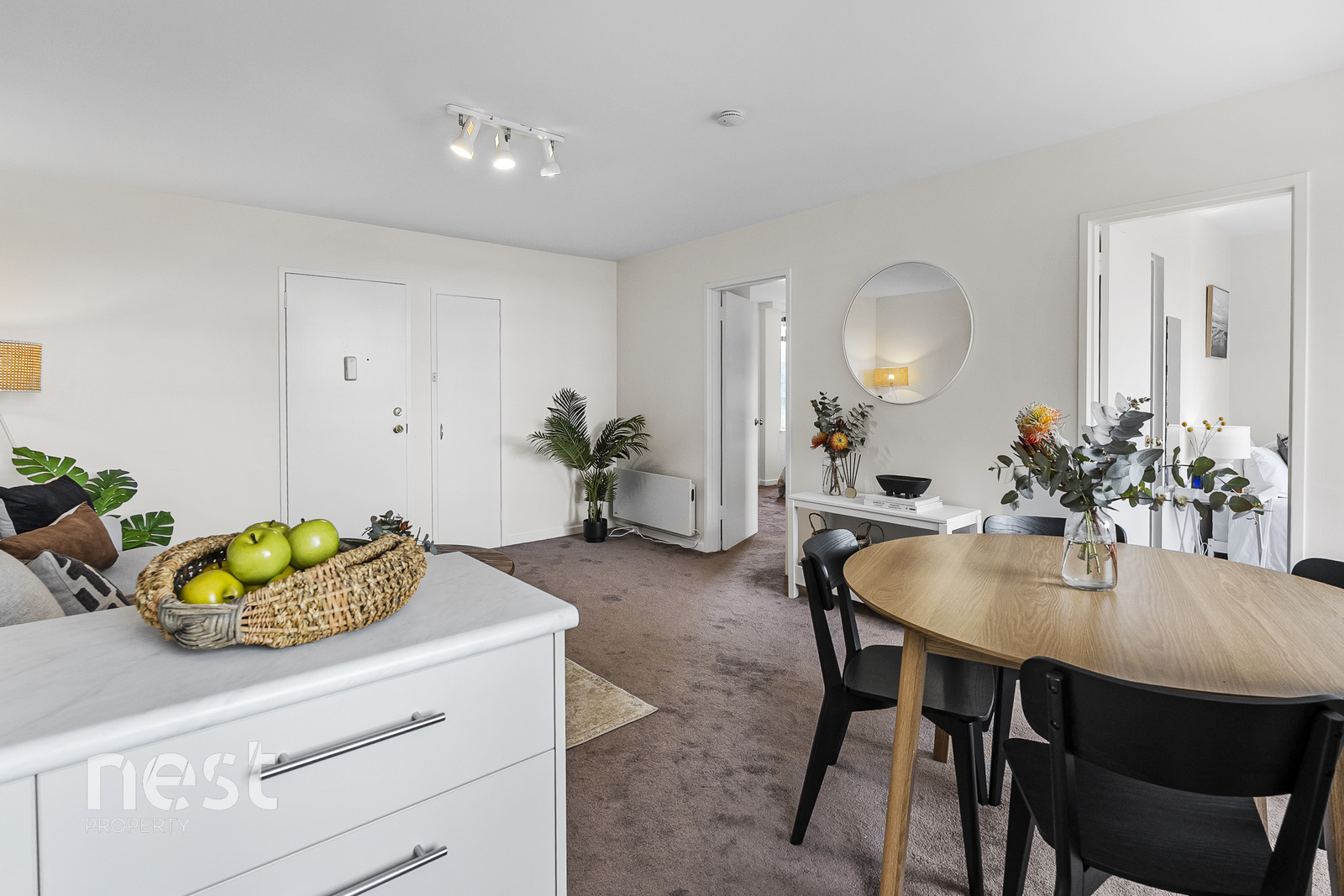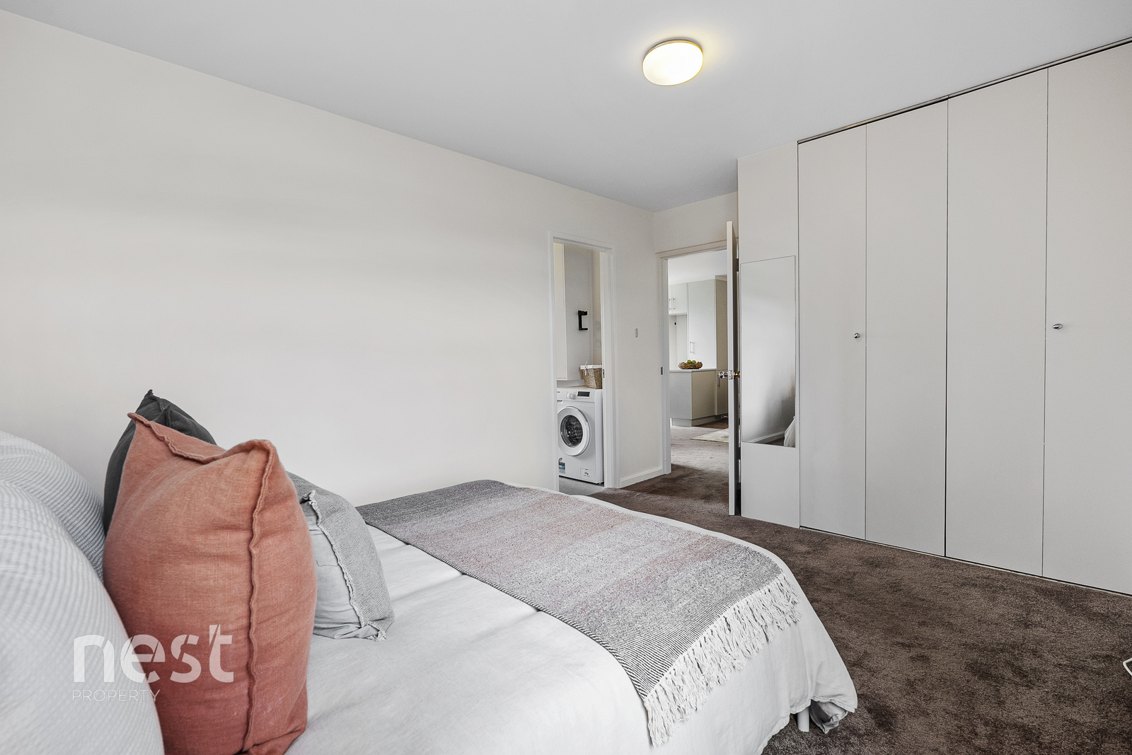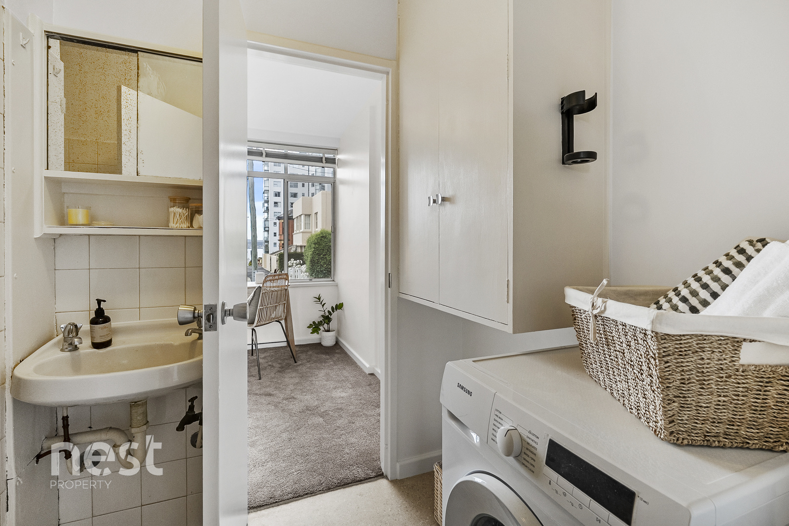 The apartment includes two bedrooms, with the spacious main featuring built-in wardrobes and an outlook toward kunanyi/Mt Wellington. A dual-access bathroom with combined laundry adds everyday practicality.