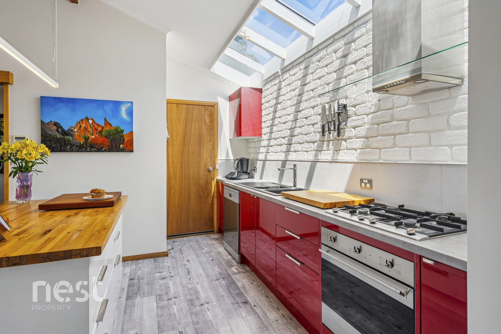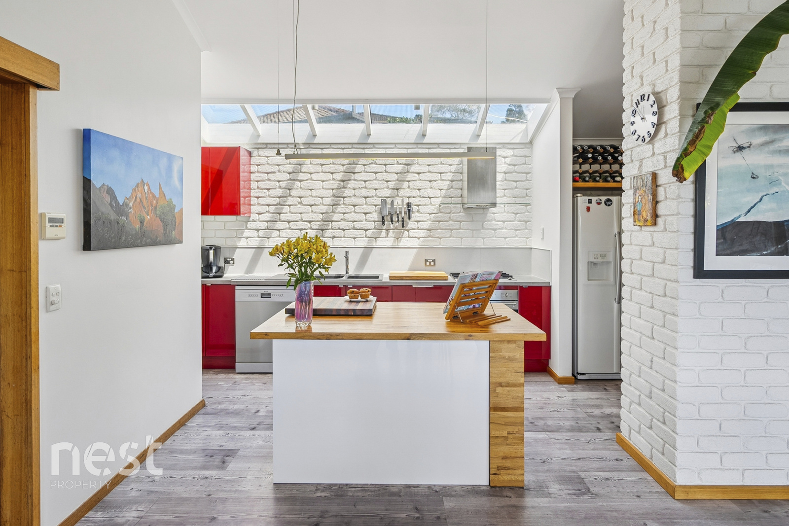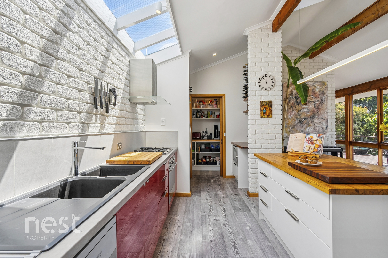 Raked ceilings, white brick accents and generous windows make every space feel bright and inviting. Skylights welcome natural light into the home, while the renovated kitchen complete with a barista station and walk-in pantry blends character with practicality.