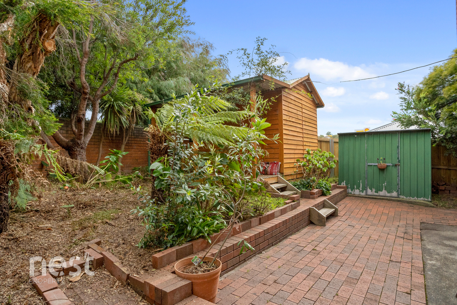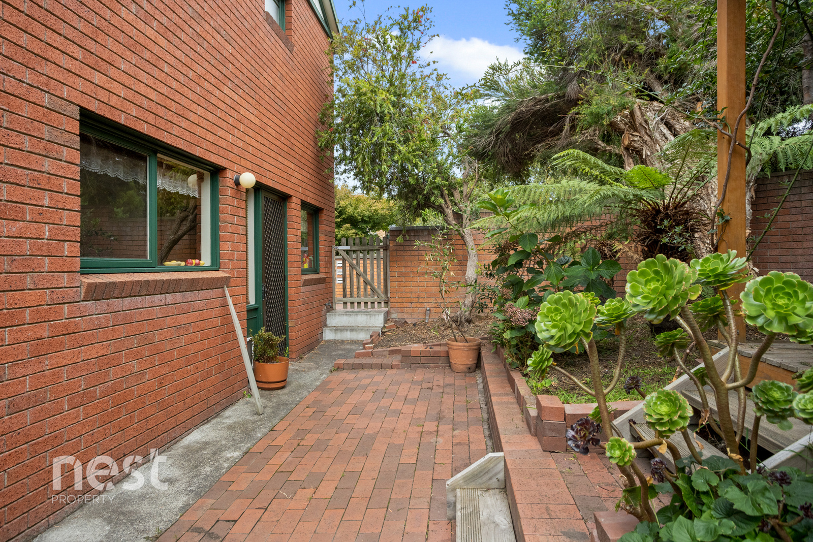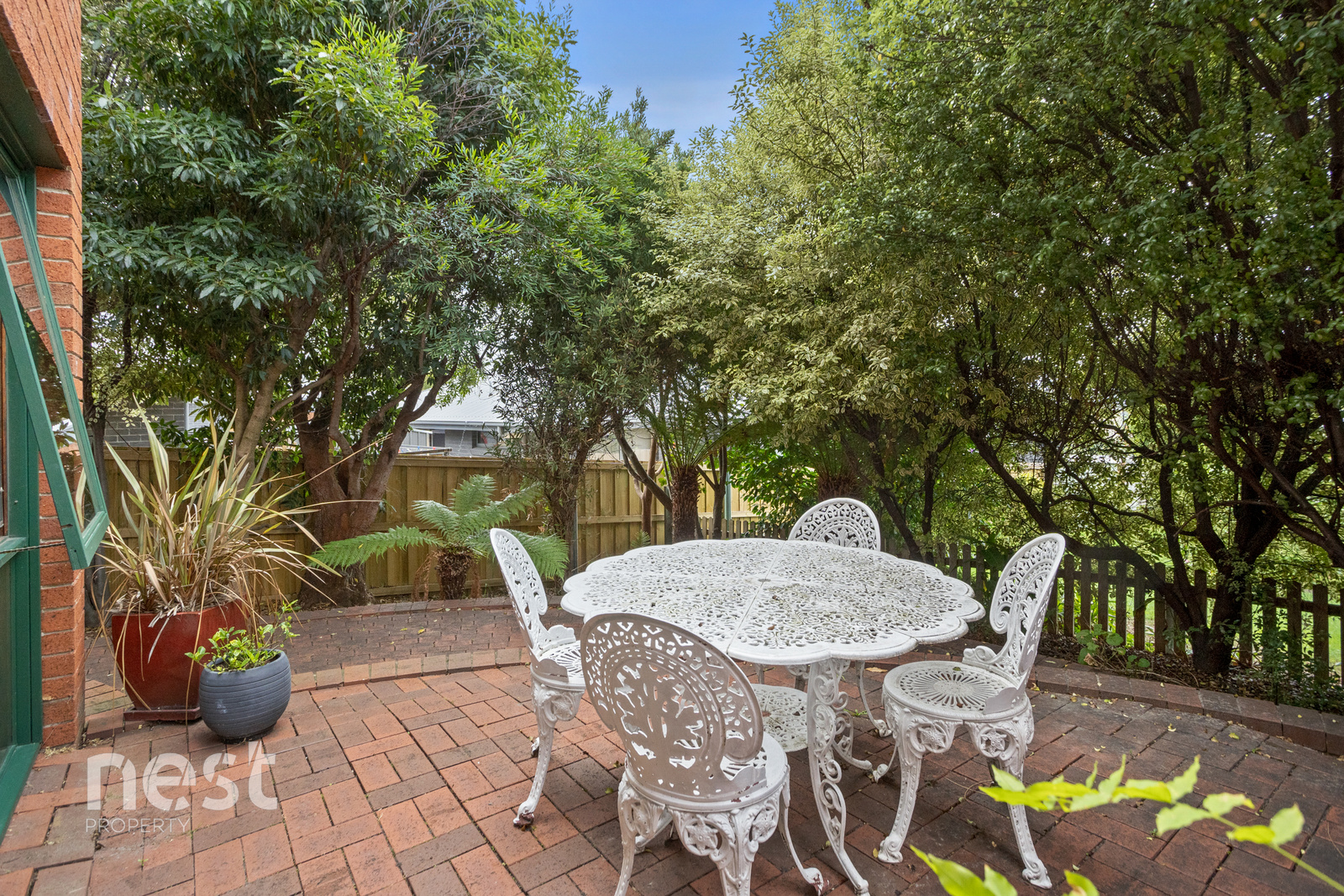 The private, leafy courtyard provides a peaceful outdoor setting with plenty of space to relax or entertain, all with minimal upkeep required.